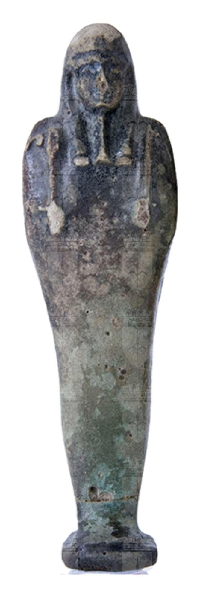 Statuina funeraria mummiforme annerita, forse per effetto del fuoco. Indossa una parrucca tripartita e la barba divina. Le mani sono incrociate ed affiancate, appena accennate: la destra tiene una zappa e la sinistra un piccone. Dalla spalla sinistra pende una sacca. Il pilastro dorsale è presente ed i piedi poggiano su una piccola base. E' presente una frattura a livello delle caviglie. L'ushabti è privo di iscrizione.