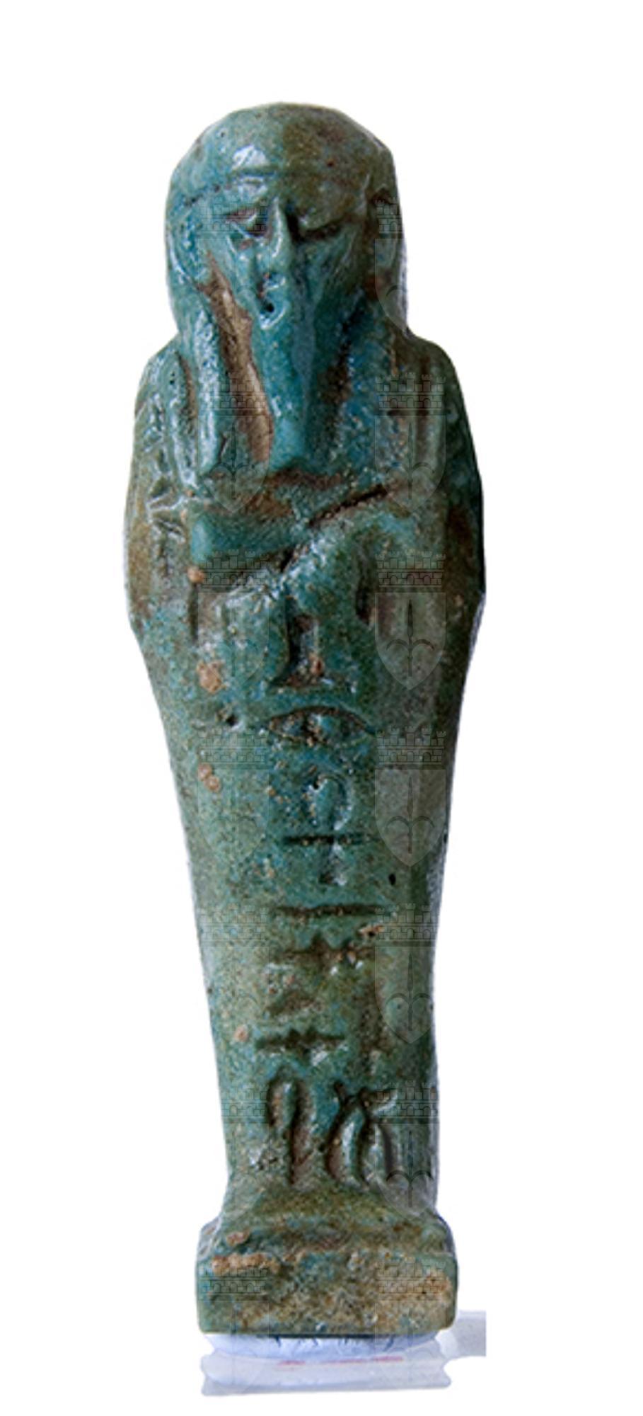 Statuina funeraria mummiforme che indossa una parrucca tripartita e la barba divina. Le mani incrociate ed affiancate portano la destra una zappa e la sinistra un piccone. Dalla spalla sinistra pende una sacca. Il pilastro dorsale è presente e termina in basso con una piccola base. L’iscrizione è costituita da geroglifici in colonna: comincia lungo le gambe e continua sul pilastro dorsale.
