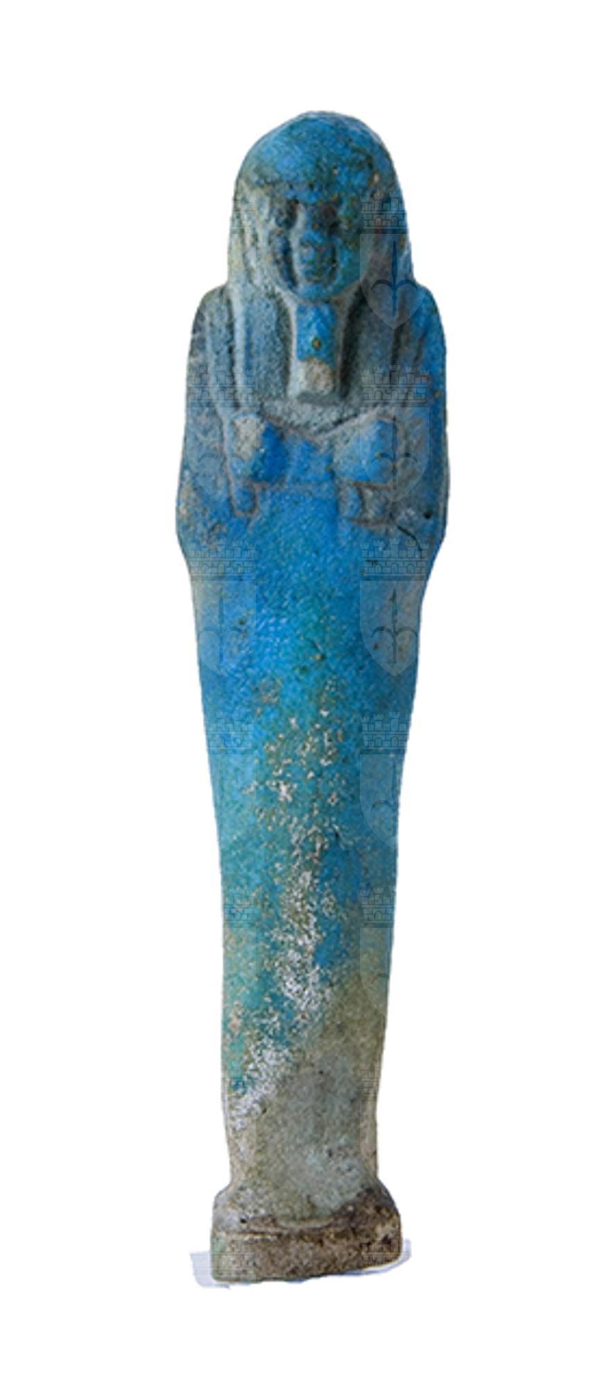 Statuina funeraria mummiforme che indossa barba divina e parrucca tripartita, la quale continua dietro direttamente con il pilastro dorsale; è presente una piccola base sotto i piedi. Le mani incrociate ed affiancate portano ciascuna una zappa. Dalla spalla sinistra pende una sacca. L’iscrizione corre lungo una colonna sul pilastro dorsale.