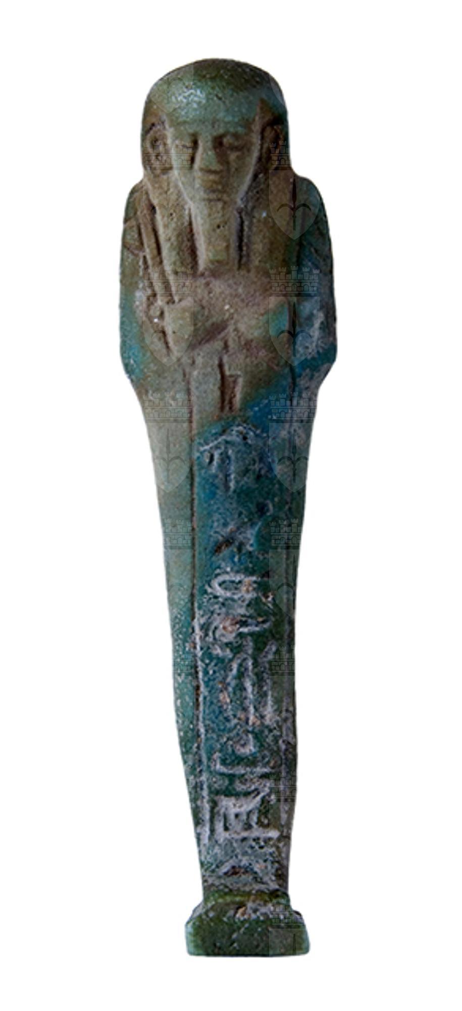 Statuina funeraria mummiforme che indossa una parrucca tripartita e la barba divina. Le mani incrociate e affiancate tengono ognuna una zappa. Una sacca pende dalla spalla sinistra. Il pilastro dorsale è presente, assieme ad una piccola base. L’iscrizione corre lungo una colonna frontale.