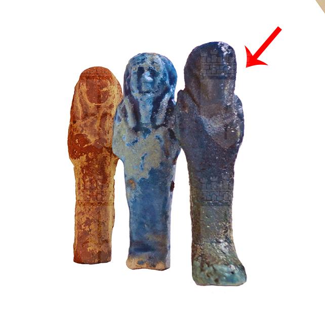 Statuina funeraria mummiforme che indossa la barba divina e una gonfia parrucca tripartita, la quale è stata rifinita nella parte posteriore. Le mani incrociate portano una zappa e forse una frusta. Dalla spalla sinistra pende una sacca. L’ushabti è privo di iscrizioni e date le ridotte dimensioni potrebbe essere stato usato come amuleto.