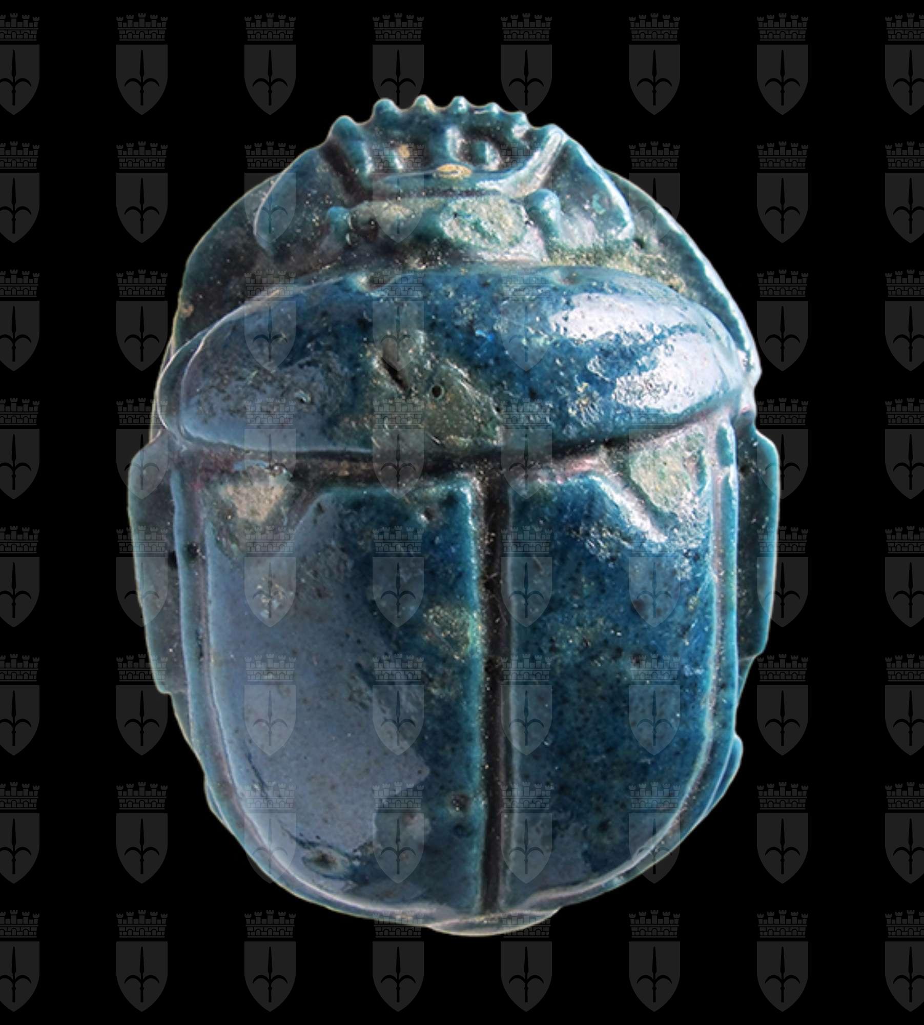 Scarabeo anepigrafe in faience blu. Dorso che presenta il clipeo e l’incisione a T che separa il protorace dalle elitre, sulle quali sono visibili tacche a V. Sui bordi esterni si vedono le zampe ripiegate. Senza foro.