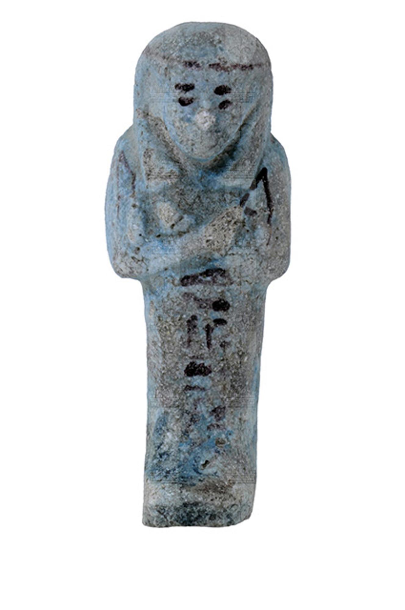 Statuina funeraria mummiforme che indossa una parrucca tripartita con seshed. Le braccia sono incrociate, la destra sopra la sinistra, e le mani tengono ognuna una zappa. Sulla schiena, una sacca centrale è sostenuta da due bretelle. I dettagli sono dipinti in nero. L’iscrizione sul davanti delle gambe è dipinta in nero e consta di una singola colonna di testo, poco leggibile