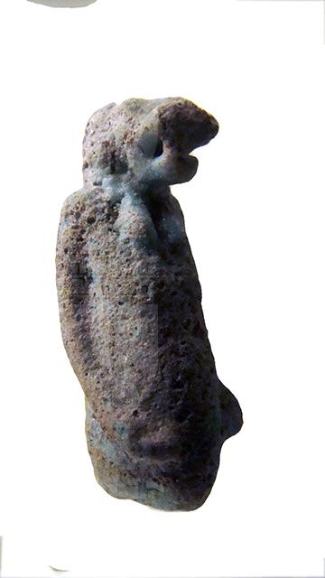 Amuleto in faience raffigurante la divinità apotropaica Toeris, patrona delle partorienti e dei neonati. La dea è raffigurata in piedi, con il muso di coccodrillo, una lunga parrucca, il corpo da ippopotamo gravido, con le braccia distese lungo il corpo. Il dorso con la coda da coccodrillo si fonde con il pilastro dorsale, che presenta una presa forata. La superficie dell'amuleto è molto consumata, ed è spezzato all'altezza delle gambe.