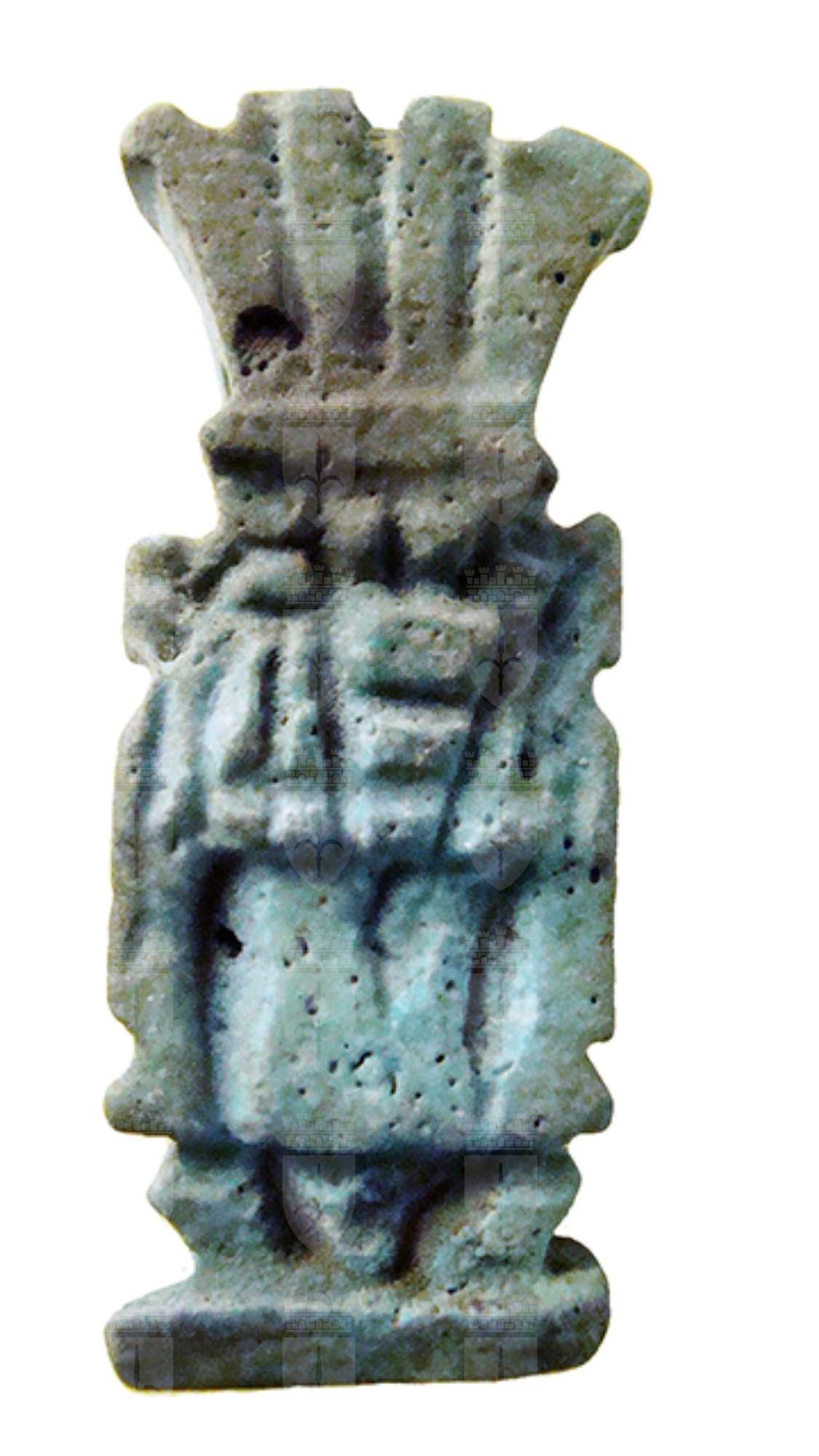 Amuleto in faience raffigurante la divinità apotropaica Bes. Il dio è raffigurato nel suo aspetto consueto: con il corpo tozzo e le gambe arcuate, le braccia appoggiate sulle cosce, il volto frontale con le orecchie sporgenti, le sopracciglia evidenziate, la barba e il grande naso piatto. Sul capo porta una corona di piume di struzzo, mentre i piedi poggiano su una piccola base quadrangolare. Presenta un foro passante all'altezza della corona.