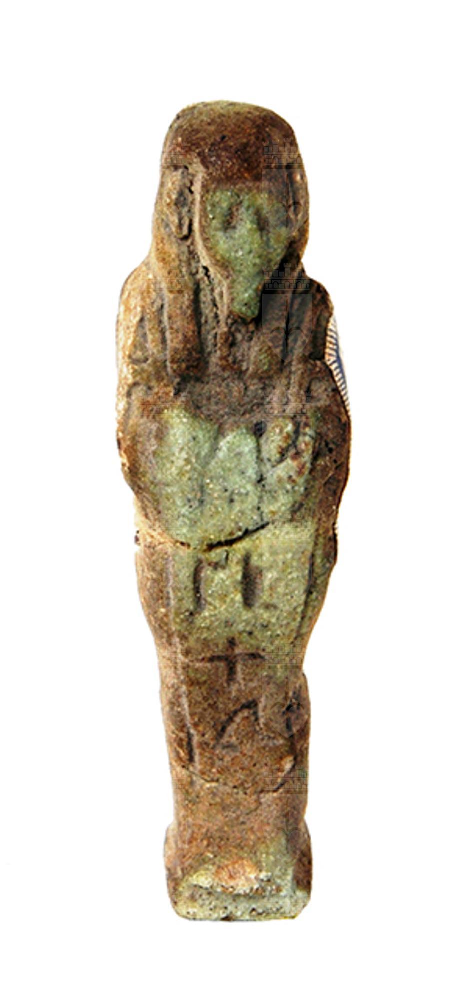 Piccola statuina funeraria mummiforme, con parrucca tripartita e corta barba divina. Le mani sono incrociate sul petto e affiancate, e reggono ciascuna una zappa. Il retro è piatto ma sotto i piedi è presente una piccola base. Le iscrizioni sono in colonna, sia davanti che sul retro, nonché - fatto insolito - sotto i piedi, ma non sembrano avere senso.