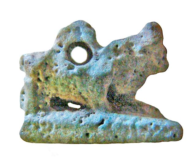 Amuleto in faience lavorato a tutto tondo, con presa forata nella parte superiore. Raffigura un toro disteso su una piccola base. A causa della minutezza dell'oggetto, i dettagli sono scarsamente distinguibili.