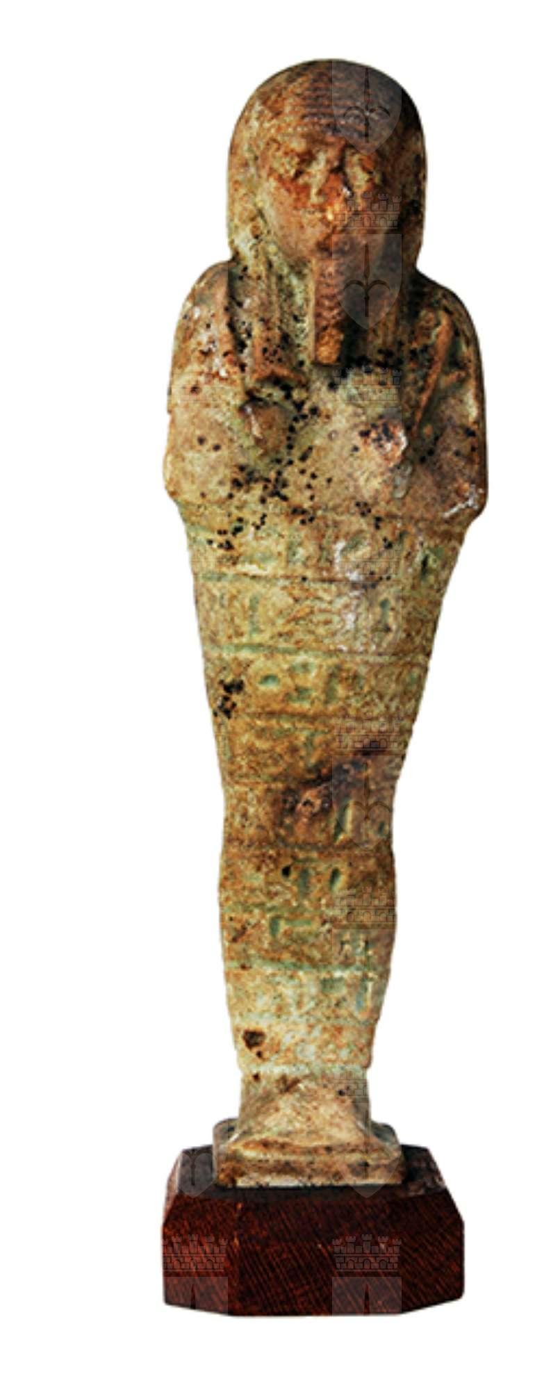 Statuina funeraria mummiforme che indossa la parrucca tripartita striata e la barba divina intrecciata. Le braccia sono incrociate sul petto, le mani sono affiancate: nella sinistra c'è una zappa e nella destra un piccone. Dietro la spalla sinistra pende una sacca. sul dorso si vede il pilastro dorsale che forma un tutt'uno con la piccola base quadrangolare. Attorno alle gambe corrono 9 righe parallele di iscrizione che riportano il capitolo 6 del Libro dei Morti e di cui è leggibile soltanto l'inizio.