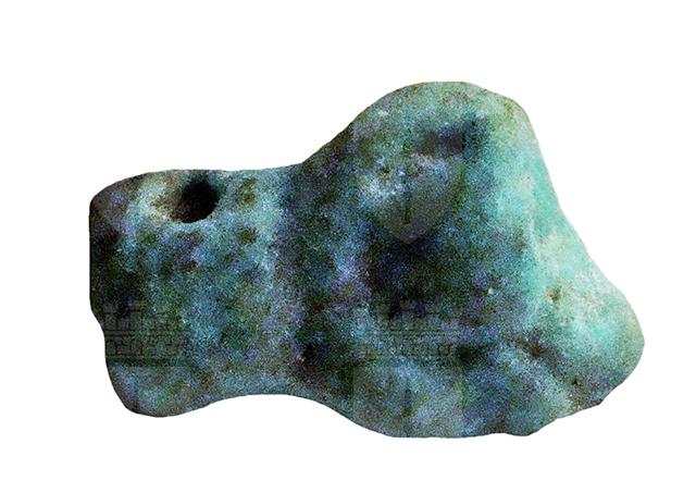 Amuleto in faience lavorato a tutto tondo, raffigurante un pugno chiuso. Nella porzione del polso è ricavato un foro passante. Un amuleto di questo tipo garantiva a chi lo portava forza e destrezza nelle attività manuali.