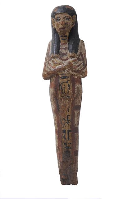 Statuina funeraria mummiforme dipinta in bianco, i dettagli sono stati aggiunti in rosso scuro, blu e nero. Indossa un collare rosso ed una parrucca tripartita nera, con le tre ciocche chiuse da fermagli dipinti in giallo. Le braccia sono incrociate e le mani tengono ognuna una zappa disegnata in rosso. Al centro della schiena vi è una sacca trapezoidale rossa, tenuta da due bretelle, e forse un sacchetto per semi dietro la spalla destra. Le gambe sono decorate con un motivo di bande rosse e blu, imitanti la fasciatura delle mummie dell’epoca. I piedi sono mancanti. L’iscrizione, dipinta in nero, è disposta su una colonna che si legge da destra a sinistra e che è inserita in un pannello ocra con contorni rossi, sul davanti delle gambe.