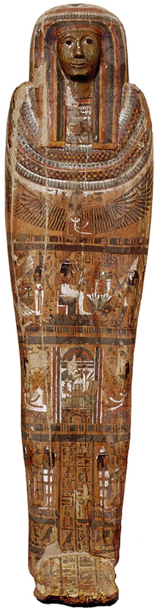 Coperchio del sarcofago Il coperchio antropoide presenta un volto dai tratti ben modellati, circondato da una parrucca a fasce longitudinali, che ricade con due bande sul petto. Sulla sommità del capo è raffigurato uno scarabeo nero con le ali aperte e allargate, fiancheggiato dal geroglifico della benda ripiegata, sormontata a destra dal segno dell’Oriente e a sinistra dalla piuma simbolo dell’Occidente. Il petto è ricoperto dal collare-usekh e da cinque registri con scene e testi, che mostrano (dall'alto): - La dea Nut ad ali spiegate, chiamata nelle brevi iscrizioni geroglifiche accanto alla testa "signora dell’Occidente" e "signora della Duat"; - Il dio Osiride, seduto su trono a basso schienale, con alle spalle la dea Iside, a cui si rivolge il dio Horo, che introduce il defunto, stante alle sue spalle. Tra i due dei, un fiore di loto sorregge i quattro geni funerari (i figli di Horo). Chiude la scena, all’estremità sinistra, su alto supporto, la dea Uto alata a testa leonina e coda di serpente, con disco solare sul capo e tra le ali il simbolo udjat. I geroglifici riportano i nomi dei personaggi raffigurati; - Al centro, in un naos (o tempietto, in forma dell’antico santuario del Basso Egitto) su un alto supporto, è posta la barca celeste Henu con un grande flabello a prua e la poppa a testa d’orice. Sulla barca naviga il Sole, in forma di falco, con il quale il defunto si identifica. A sinistra, la dea Neith inginocchiata protende le braccia flesse verso la barca, mentre dietro ha lo scettro-sekhem; in posizione simmetrica dall'altro lato, la dea scorpione Selkis, con alle spalle il geroglifico dell’Occidente. I due brevi testi accanto alle dee indicano l'azione da esse compiuta: "proteggere Pa-sen-en-hor"; - Due colonne di testo al centro (che coprono anche il rialzo dei piedi) dividono il quarto registro: a sinistra vi è una scena con il dio Horo che unge il defunto mummiforme (accompagnato da due brevi iscrizioni "Horus figlio di Iside e di Osiride" sotto la scena e "Proteggere Pa-sen-en-hor alle spalle del dio); a destra la scena è simmetrica, ma con il dio Anubi (identificato grazie all'iscrizione sotto la scena, che recita "Anubi, signore della terra sacra, preposto alla tenda dell'imbalsamazione"); - Sul rialzo dei piedi, ai lati delle colonne del testo, due emblemi dell’Occidente. Cassa del sarcofago Sui lati esterni della cassa vi sono due uniche righe di iscrizione in bei caratteri geroglifici, mentre all'interno il fondo della cassa è occupato per circa due terzi dalla figura della dea Nut, ritta, vista frontalmente. La dea ha braccia aperte, flesse verso l’alto, protese sui lati della cassa, e in ciascuna mano tiene il segno della vita. Porta sul capo ampia parrucca dipinta in verde, le cui bande anteriori le incorniciano il volto, disegnato frontalmente. Vicino al corpo della dea, a sinistra, si scorgono tracce di segni geroglifici, purtroppo illeggibili. All’altezza del capo, la dea è fiancheggiata, a destra dal falcone Harakhti (= Horo dell’Orizzonte) e a sinistra da un airone, sui quali sono alcuni geroglifici e il segno della vita; ambedue gli uccelli stanno sul geroglifico dell’Occidente, e sono dipinti in verde, col piumaggio nero e bianco. Sopra la dea Nut, e separato da questa da due fasce verde scuro (quella inferiore con una serie di stelle affiancate, ideogramma del cielo stellato, quella superiore a segmentini verde chiaro) si erge il pilastro djed sormontato dal disco solare, e fiancheggiato da due dee, molto probabilmente Iside e Nefti. La zona davanti all’altra dea e quella soprastante il disco solare in corrispondenza all’appoggio della testa del defunto, invece, sono fortemente impregnate di bitume.