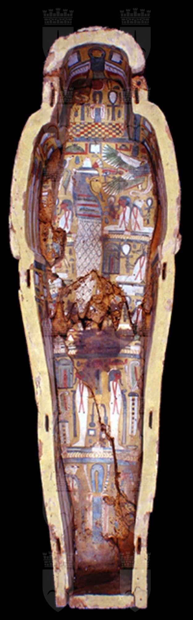 La moltitudine delle immagini, distribuite in vignette alternate a colonne di geroglifici, così come i testi stessi, ripropongono il culto del dio Osiride e del sole, affermando l’idea del viaggio eterno dell’astro, a cui la defunta partecipa essendo ella stessa una parte del grande dio. Puntuali confronti con sarcofagi custoditi presso il Museo nazionale di Napoli, il British Museum e il Petrie Museum di Londra, evidenziano la sua appartenenza al gruppo dei cosiddetti “yellow coffins”, datato alla fine della XXI dinastia e in uso particolarmente nell’ambito della casta sacerdotale di Amon a Tebe. Si tratta di un sarcofago femminile, come è dimostrato dai seni, riconoscibili sotto le bande della parrucca, dalla particolare lunghezza di queste ultime, dal fatto che le orecchie non sono visibili e dal colore del volto. I testi geroglifici della cassa non riportano il suo nome (a meno che non si trovasse nella porzione ormai illeggibile del testo del coperchio) e questa circostanza, riscontrata anche in altri esemplari simili, risulta essere un’altra caratteristica della fine della XXI dinastia. La proprietaria fu probabilmente una sacerdotessa di Amon vissuta nella zona tebana.
