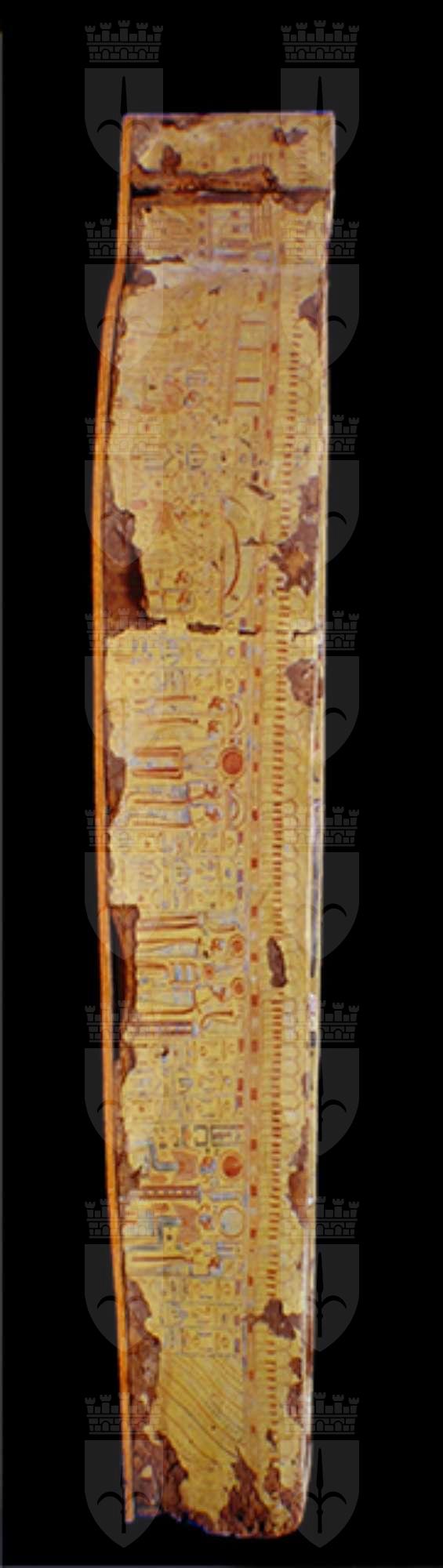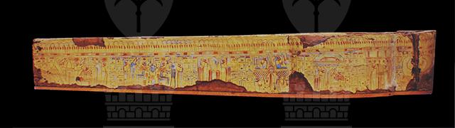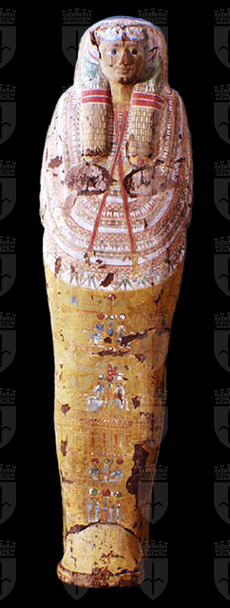La moltitudine delle immagini, distribuite in vignette alternate a colonne di geroglifici, così come i testi stessi, ripropongono il culto del dio Osiride e del sole, affermando l’idea del viaggio eterno dell’astro, a cui la defunta partecipa essendo ella stessa una parte del grande dio. Puntuali confronti con sarcofagi custoditi presso il Museo nazionale di Napoli, il British Museum e il Petrie Museum di Londra, evidenziano la sua appartenenza al gruppo dei cosiddetti “yellow coffins”, datato alla fine della XXI dinastia e in uso particolarmente nell’ambito della casta sacerdotale di Amon a Tebe. Si tratta di un sarcofago femminile, come è dimostrato dai seni, riconoscibili sotto le bande della parrucca, dalla particolare lunghezza di queste ultime, dal fatto che le orecchie non sono visibili e dal colore del volto. I testi geroglifici della cassa non riportano il suo nome (a meno che non si trovasse nella porzione ormai illeggibile del testo del coperchio) e questa circostanza, riscontrata anche in altri esemplari simili, risulta essere un’altra caratteristica della fine della XXI dinastia. La proprietaria fu probabilmente una sacerdotessa di Amon vissuta nella zona tebana.