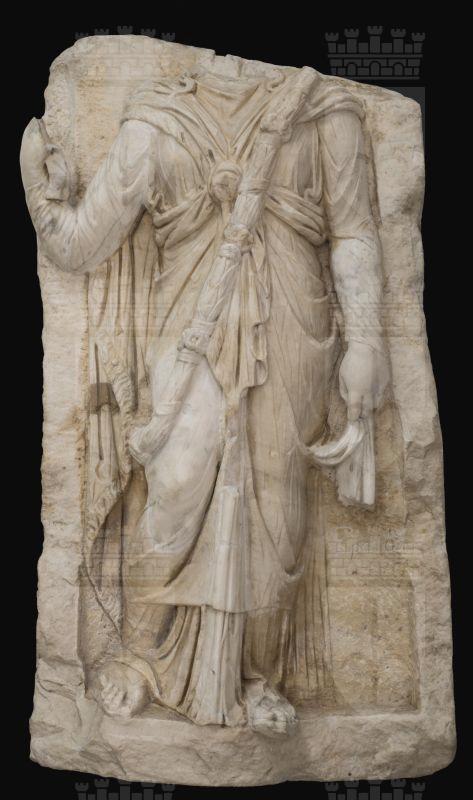 Stele funeraria raffigurante ad alto rilievo la figura stante della defunta in veste di sacerdotessa isiaca, acefala, con integrazioni dell'Ottocento: sono rifatti l'avambraccio sinistro, il braccio destro, la punta del piede sinistro, la parte inferiore della gamba destra ed il drappeggio centrale. Conseguente al restauro è l'iscrizione tarda in greco che l'identifica come la musa Erato. Sullo sfondo, la figura si staglia maestosa nell’ampia tunica con le lunghe maniche aderenti e il mantello ornato di frangia incrociato sul petto con il caratteristico nodo. La donna porta a tracolla una corona con lunghe foglie intervallate da ciocche di fiori che la tengono unita. Incede piegando la gamba destra, reggendo con la mano sinistra un lembo del manto e con la destra il sistro, del quale si vede solo un frammento.