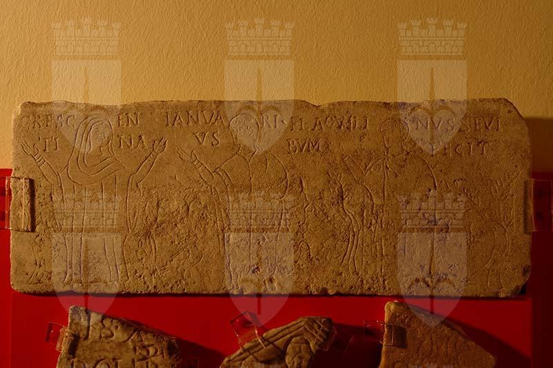 La scena raffigura all'interno di un ambiente agreste (il Paradiso) tre personaggi che si distinguono per gli abiti raffinati: due uomini che indicano con la mano destra una donna che si trova alla loro sinistra. Essa, di nome Crescentina sta in posizione di orante con il capo velato e indossa sopra la tunica manicata una dalmatica ornata di clavi. Al centro, tra ramoscelli e due colombe, sta Ianuarius con sopravveste sulla tunica manicata. Il terzo personaggio, tra due alberi, Flavius Aquilinus, porta tunica manicata corta legata al fianco e ornata da un orbiculum sulla spalla destra, sulla quale è affibbiata una lunga clamide impreziosita dal ricamo di un inserto quadrato (tablion).