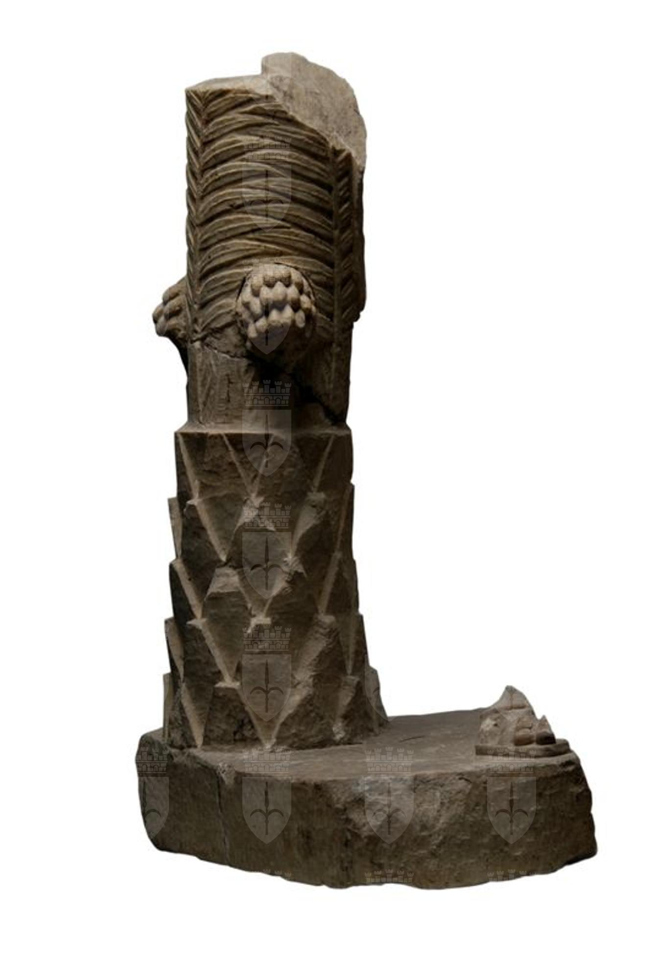 Su un frammento del plinto squadrato rimane parte del piede sinistro di uomo, poggiato su suola, e la base del sostegno raffigurante un tronco di palma dalle grosse squame triangolari nella zona inferiore e lievi arrotondate superiormente; dal tronco emergono due grappoli di datteri disposti su file orizzontali.