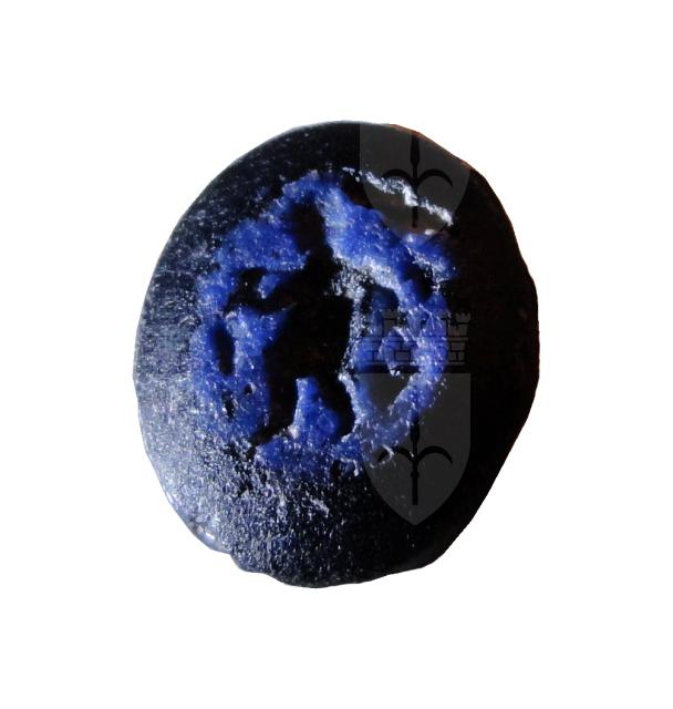 Gemma ovale piana con figura andante a destra e portante vari oggetti. Pescatore con pesci?