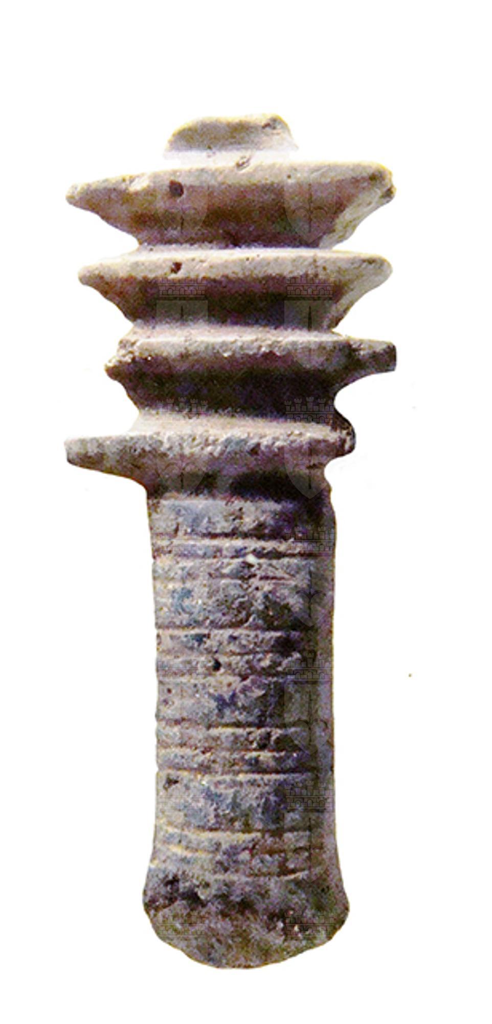 Amuleto in pietra, con foro passante, che raffigura il geroglifico "djed", a forma di pilastro con quattro espansioni nella parte superiore, che indica stabilità, immutabilità, eternità, resurrezione, ma anche forza inestinguibile ed incorruttibilità. Già nella Prima Dinastia (3150 – 2925 a.C.) era un pilastro intorno al quale venivano legate spighe di grano; dal Nuovo Regno (1543 – 1078 a.C.) fu interpretato anche come spina dorsale di Osiride. Un djed, meglio se in oro, era posto sulla gola del defunto durante il suo funerale, con il compito di farlo divenire uno spirito santificato e perfetto, un seguace di Osiride. Nel capitolo 155 del Libro dei Morti l’amuleto fa sì che “è tua nuovamente la tua spina dorsale e le tue vertebre, così che puoi tornare a muoverti...”.