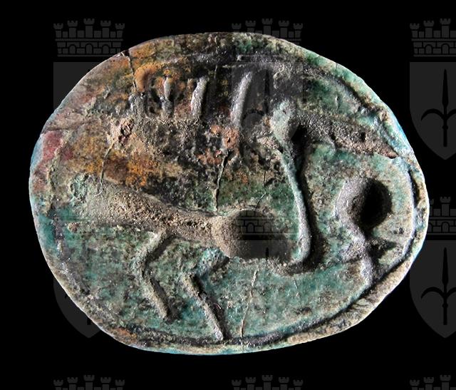 Scarabeo in steatite invetriata turchese con sul ventre una incisione crittografata del nome di Amon-Ra con anatra, segno men e geroglifico ankh. Questa, come le seguenti crittografie in cui compare un’anatra, mancano del consueto segno della piuma. Dorso con clipeo ed incisione a T che separa protorace ed elitre. Foro passante longitudinale.