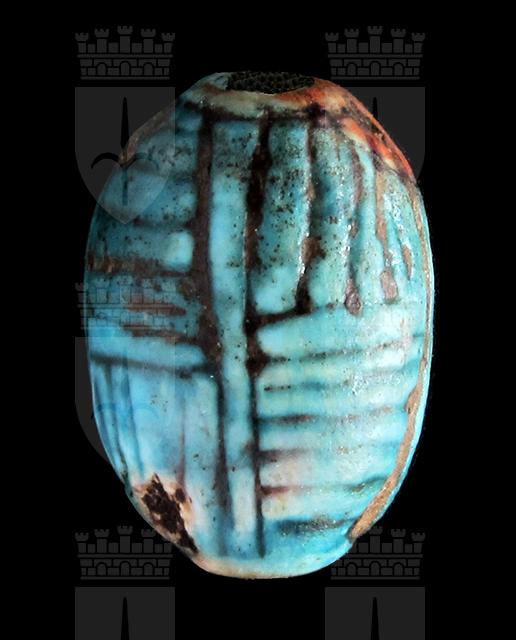 Scaraboide in steatite invetriata turchese con sul ventre una incisione che imita il nome Neb-maat-ra. Sul dorso un motivo centrale a croce dà origine ad una lavorazione geometrica. Foro passante longitudinale.