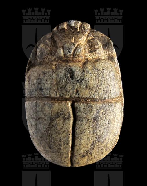Scarabeo in steatite marrone; sul ventre, sotto un segno neb rovesciato si vede uno pseudo cartiglio imitante quelli col prenome di Thutmosi III in disposizione orizzontale, dal quale pende a sinistra un ureo. Davanti a questo vi è un falco molto stilizzato disposto perpendicolarmente rispetto al resto della decorazione. Dorso con clipeo; protorace ed elitre separati da incisione a T. Foro passante longitudinale.