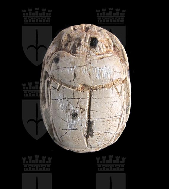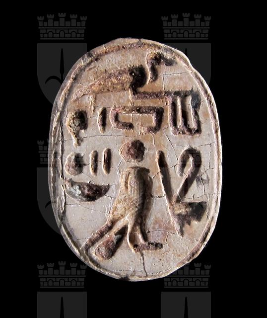 Scarabeo in steatite grigia; sul ventre incisione con segni geroglifici che costituiscono una formula non interpretabile con sicurezza. Dorso con clipeo e incisione a T che separa protorace ed elitre, le quali presentano tacche a V; sui lati si vedono le zampe ripiegate. Foro passante longitudinale.