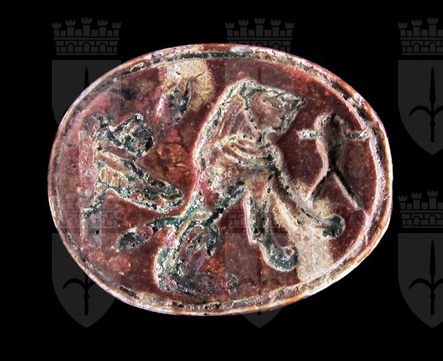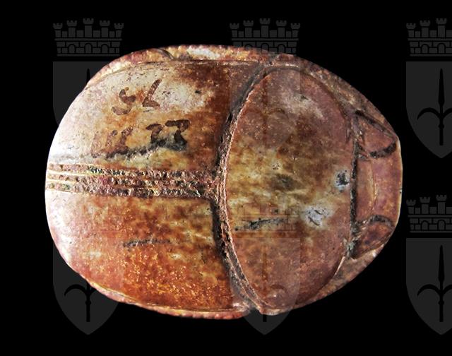 Scarabeo in steatite marrone con sul ventre incisione che rappresenta al centro un leone seduto, a sinistra un cobra alato e a destra il segno geroglifico che significa “protezione”. Dorso con incisione a T che divide il protorace e le elitre, clipeo stilizzato. Foro passante longitudinale.
