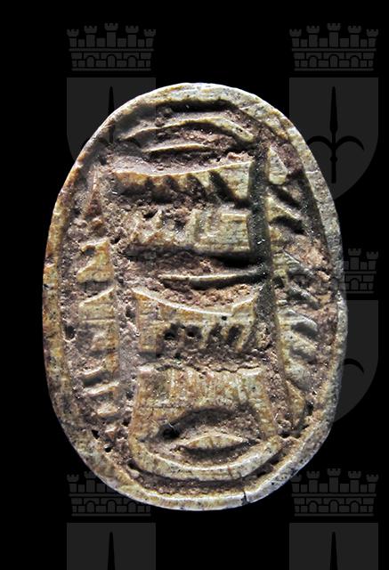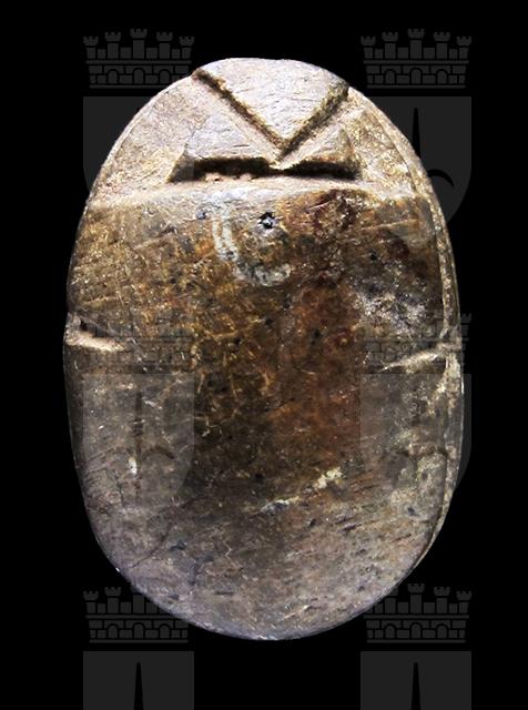 Scarabeo in steatite grigia con sul ventre una incisione, su una colonna affiancata da due segni neb, dello schema decorativo “a-n-r”. Dorso molto semplice, con incisione a V del clipeo e piccole tacche laterali all’altezza del protorace. Foro passante longitudinale.