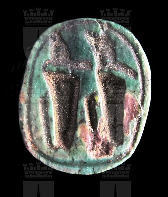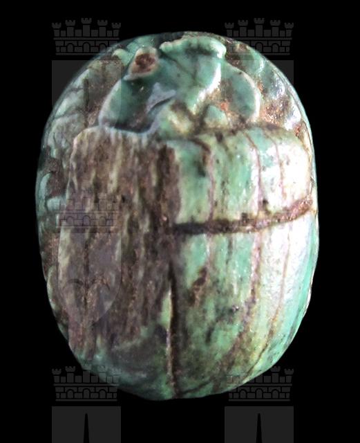 Scarabeo in steatite invetriata turchese con, sul ventre, l'incisione di due urei con le corone dell’Alto e Basso Egitto. Sebbene il dorso presenti una scheggiatura nella parte sinistra, sono comunque visibili il clipeo e la divisione tra protorace ed elitre. Foro passante longitudinale.