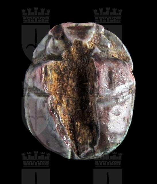 Scarabeo in steatite invetriata turchese; sul ventre si vedono una piuma ed un ureo racchiusi entro un ovale. Il dorso è danneggiato, ma si vedono comunque il clipeo e la divisione di elitre e protorace. Foro passante longitudinale.
