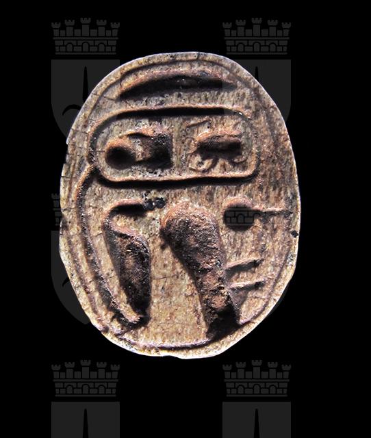 Scarabeo in steatite marrone grigiastra; sul ventre, sotto un segno neb rovesciato si vede un cartiglio col prenome di Thutmosi III in disposizione orizzontale, dal quale pende a sinistra un ureo. Davanti a questo vi sono un segno ankh ed un falco molto stilizzato disposti perpendicolarmente rispetto al resto della decorazione. Dorso con decorazioni sulla testa che contornano l’elaborato clipeo, incisione a T che separa protorace ed elitre. Foro passante longitudinale.