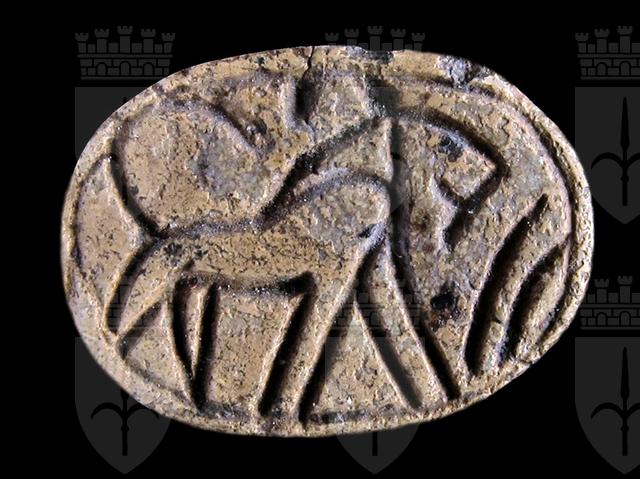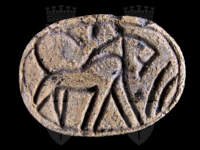 Scarabeo in steatite marrone, con sul ventre incisione che rappresenta leone andante. Dorso molto stilizzato, incisione soltanto del semplice clipeo. Foro passante longitudinale.