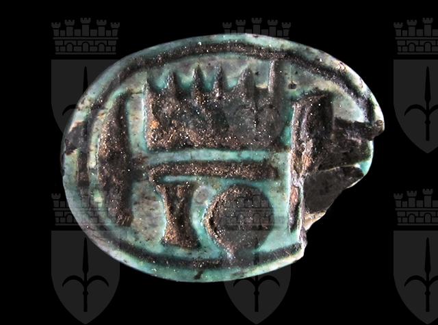 Scarabeo in steatite invetriata azzurra con sul ventre incisione del nome di Amon-Ra all’interno di un ovale, sulla sinistra un segno neb con funzione di riempitivo. Dorso con clipeo sulla testa e incisione a T che separa il protorace dalle elitre, che presentano terminazioni a “ricciolo”. Foro passante longitudinale.