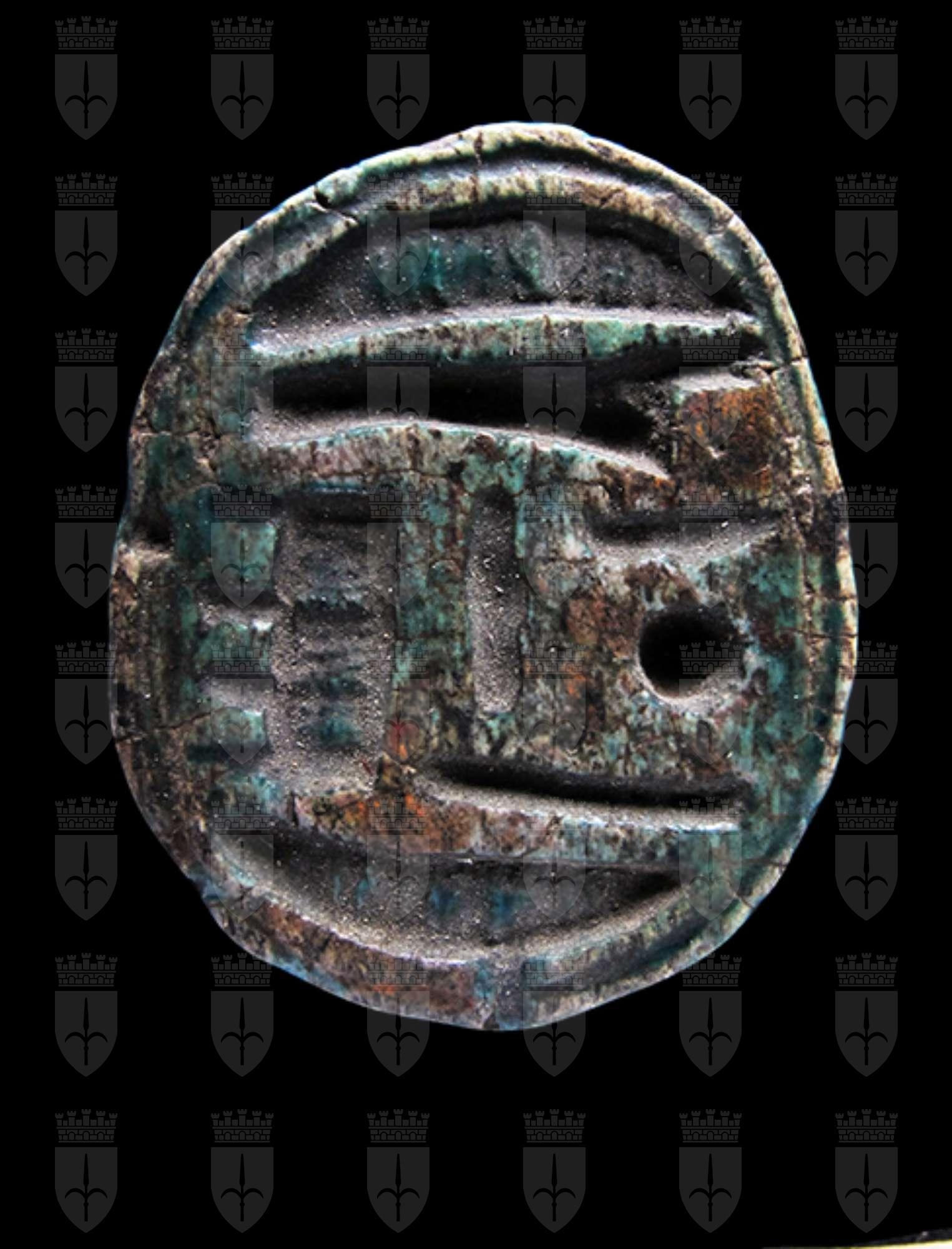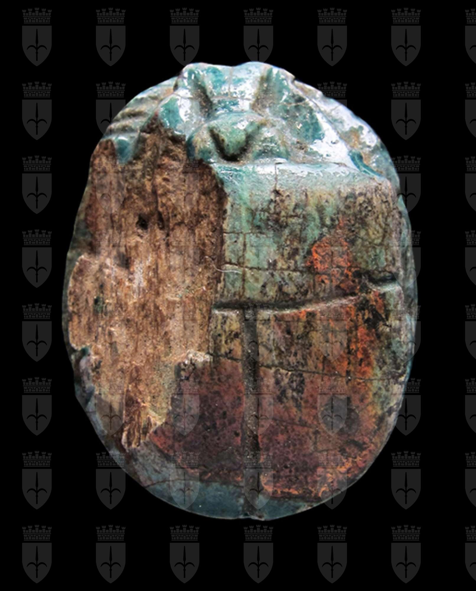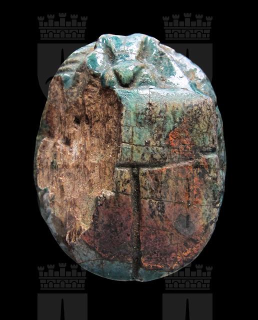 Scarabeo in steatite invetriata turchese con sul ventre incisione del nome di Amon-Ra tra due segni neb. Il dorso è scheggiato nella parte sinistra, ma rimangono visibili le incisioni del clipeo e le elitre. Foro passante longitudinale.