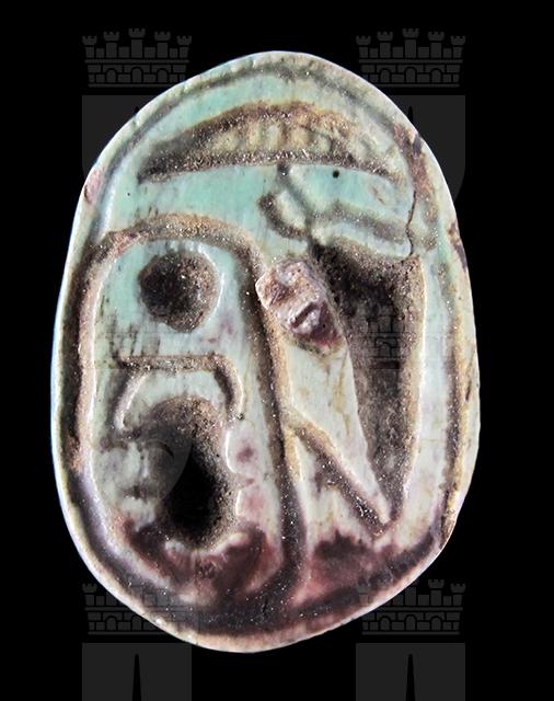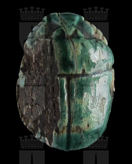 Scarabeo in steatite invetriata turchese; sul ventre, sotto un segno neb capovolto si vedono a sinistra il cartiglio col prenome di Thutmosi III e a destra un ureo. Dorso con una scheggiatura sulla parte sinistra, rimangono visibili le incisioni del clipeo e delle elitre. Foro passante longitudinale
