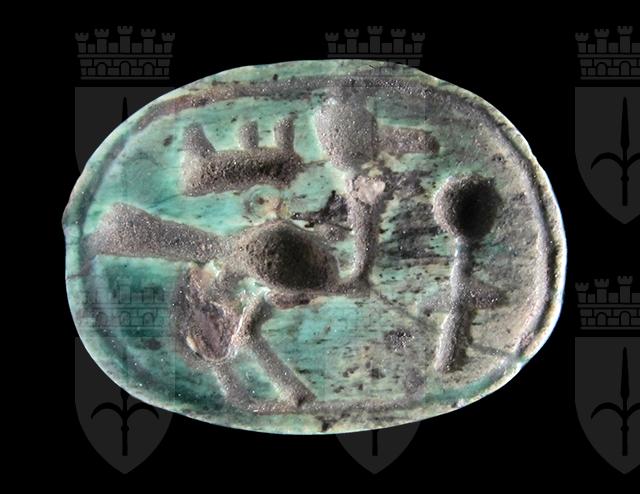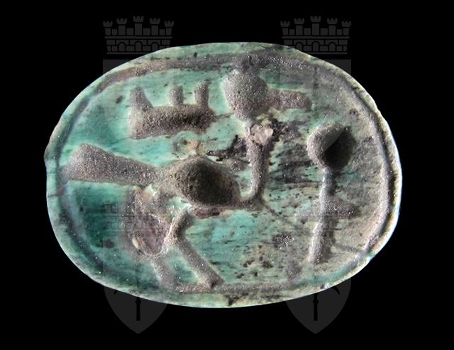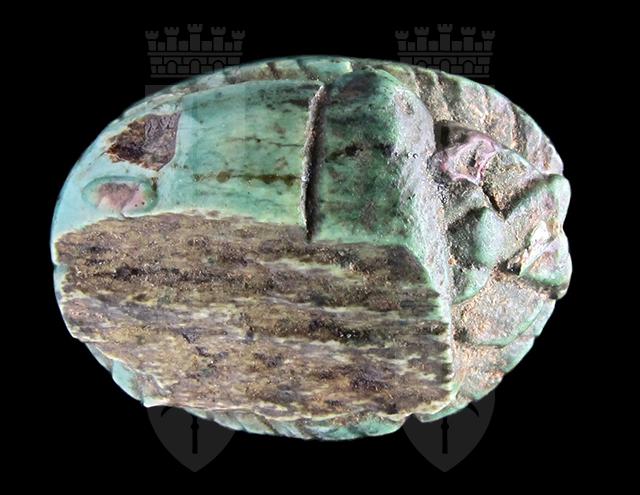Scarabeo in steatite invetriata turchese con sul ventre incisione crittografica del nome di Amon-Ra. Sul dorso si intravedono le incisioni di clipeo, protorace ed elitre. Foro passante longitudinale.