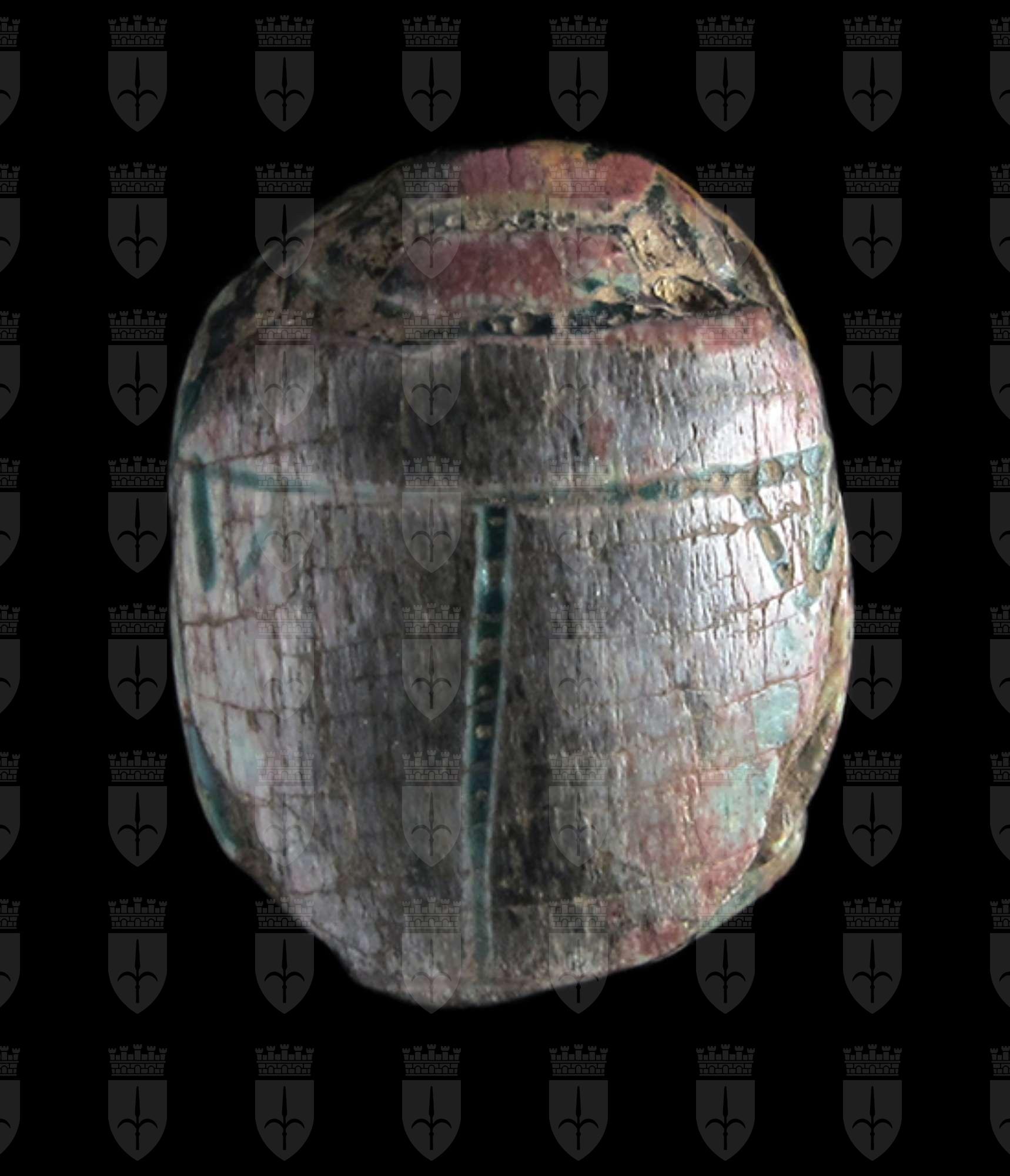 Scarabeo in steatite invetriata turchese con sul ventre incisione che rappresenta due divinità, con disco solare sopra il capo, che si tengono per mano. Dorso con incisione di clipeo, protorace ed elitre, sulle quali sono presenti tacche a V. Foro passante longitudinale.