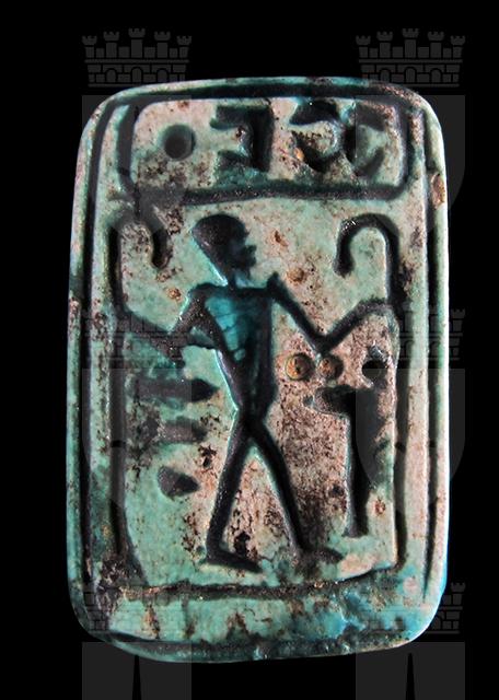 Piastra rettangolare in steatite invetriata azzurra; su di una faccia si vede in alto un cartiglio con il nome Menkheperra, prenome del faraone Thutmosi III, scritto in modo alquanto stilizzato. Sotto il dio Heh tiene due rami di palma: questa scena si può interpretare come un augurio: “Milioni di anni”. Accanto alla figura del dio si vedono alcuni segni, tra cui forse una tavola per offerte. Dorso con l’incisione di due coccodrilli. Foro passante longitudinale.