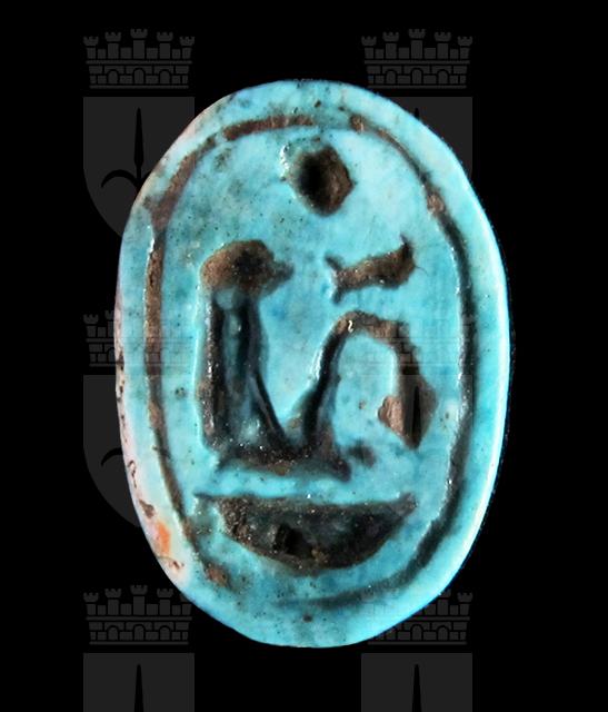 Scaraboide in steatite invetriata turchese con sul ventre una incisione che imita il nome Neb-maat-ra. Sul dorso un motivo centrale a croce dà origine ad una lavorazione geometrica. Foro passante longitudinale.