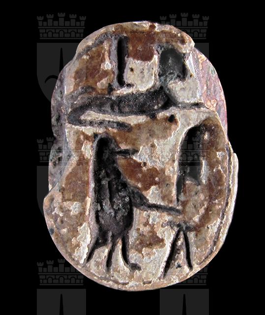Scarabeo in steatite invetriata marrone con sul ventre incisione che raffigura la dea Toeris che regge una piuma, da cui forse pendono due nastri. Sopra vi è una sfinge, al di sopra della quale vi è un segno geroglifico. Sul dorso è visibile il semplice clipeo e l’incisione a T che divide il protorace dalle elitre. Foro passante longitudinale.