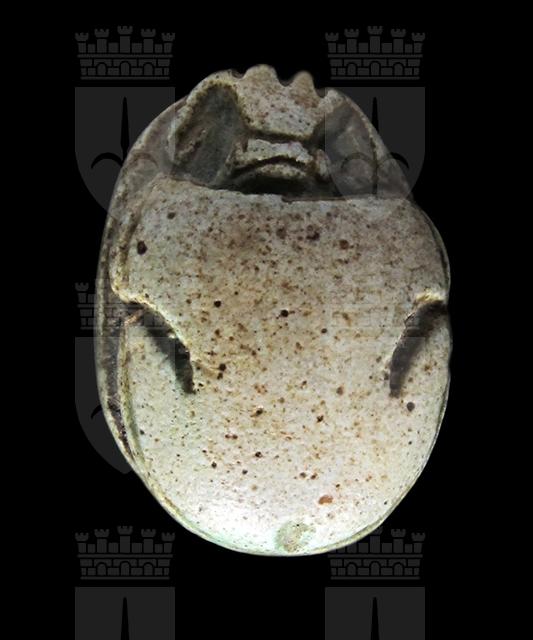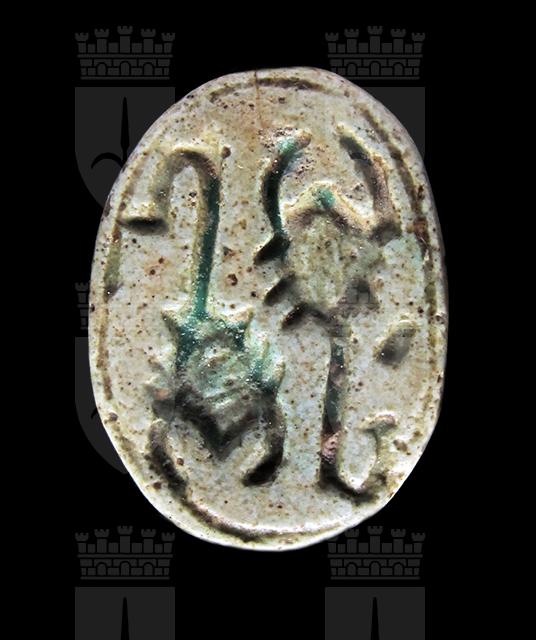 Il ventre reca l’immagine di due scorpioni. Dorso con clipeo e piccole tacche a V sul protorace. Conserva tracce dell’invetriatura nelle incisioni. Foro passante longitudinale.