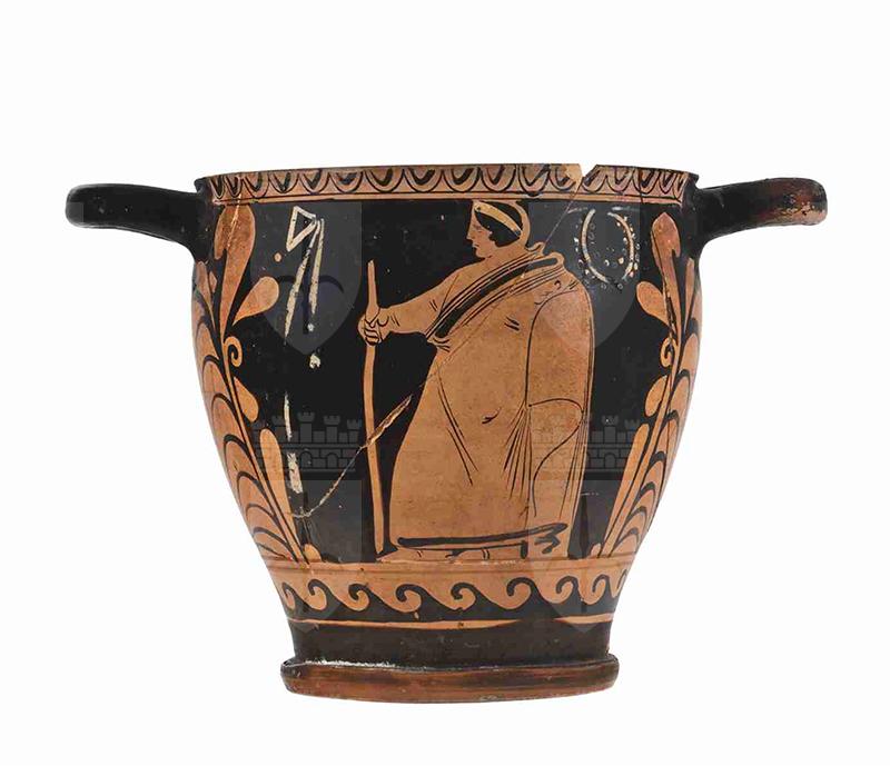 Il vaso presenta un corpo di forma troncoconica dal profilo leggermente convesso, rialzato su un piede ad anello dal profilo convesso e con listello, con tracce di vernice nera. Le anse a nastro sono impostate orizzontalmente poco sotto l'orlo, leggermente estroflesso. La vernice nera, opaca, copre interamente anche l'interno della vasca del vaso. Alcuni dettagli, come sulle ali dell'erote, presentano sovradipinture in bianco. Il colore dell'argilla varia da Munsell 5YR 6/6 (reddish yellow) a 2.5YR 5/8 (red). Sul lato A troviamo un erote alato, rivolto a sinistra, nudo ad eccezione dei calzari, seduto su un tralcio a spirale. Porta i capelli ricciuti raccolti all'altezza della nuca, cinti da un diadema; le ali sono molto curate, con tre file di penne, le due superiori, più corte, dettagliate da piccoli tratti paralleli, quella inferiore con file verticali di punti bianchi. Regge nella mano sinistra, poggiata sul tralcio, un serto e nella sinistra, portata all'altezza del volto, uno specchio. Porta inoltre dei gioielli: una collana e una bandoliera di perle; i gioielli, il serto e lo specchio presentano dettagli sovradipinti in bianco. Compaiono, sospesi e resi in bianco, un tralcio fiorito sulla sinistra e un nastro. Sul lato B, vi è la tozza figura di un giovane ammantato, di profilo, rivolto a sinistra, rappresentato in maniera piuttosto rozza: l'himation nasconde completamente il corpo, ad esclusione del braccio e della spalla destra ed è decorato con una fascia nera presso il collo, ornato da ricche pieghe, e l'orlo inferiore. Il giovane porta i capelli corti cinti da una fascia e si appoggia ad un bastone con la mano destra. Anche su questo lato, una ghirlanda e un nastro sono sospesi sullo sfondo. La decorazione accessoria include un motivo ad ovuli pendenti subito sotto all'orlo, limitato da un filetto a ri-sparmio. Sotto le figure, inquadrato da due filetti a risparmio, dei quali quello superiore funge da appoggio alle figure stesse, un motivo ad onde marine sinistrorso. Ai lati, una grande palmetta affiancata da motivi fogliati e girali. Sotto il piede è presente una vecchia etichetta, indicante la data di acquisizione da parte del museo ('12 luglio 1905') e l'attuale numero di inventario generale.