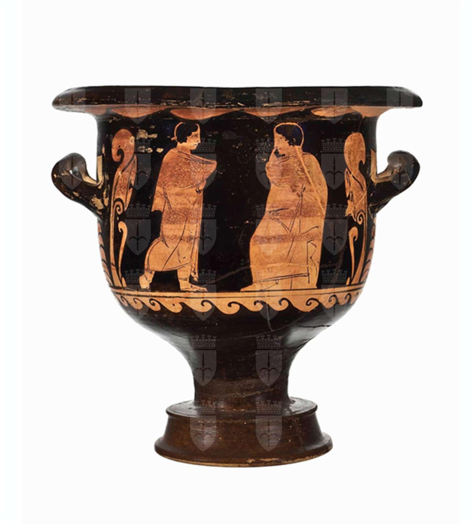 Cratere a campana campano a figure rosse Lato A: scena tetrale dionisiaca; Lato B: giovani ammantati