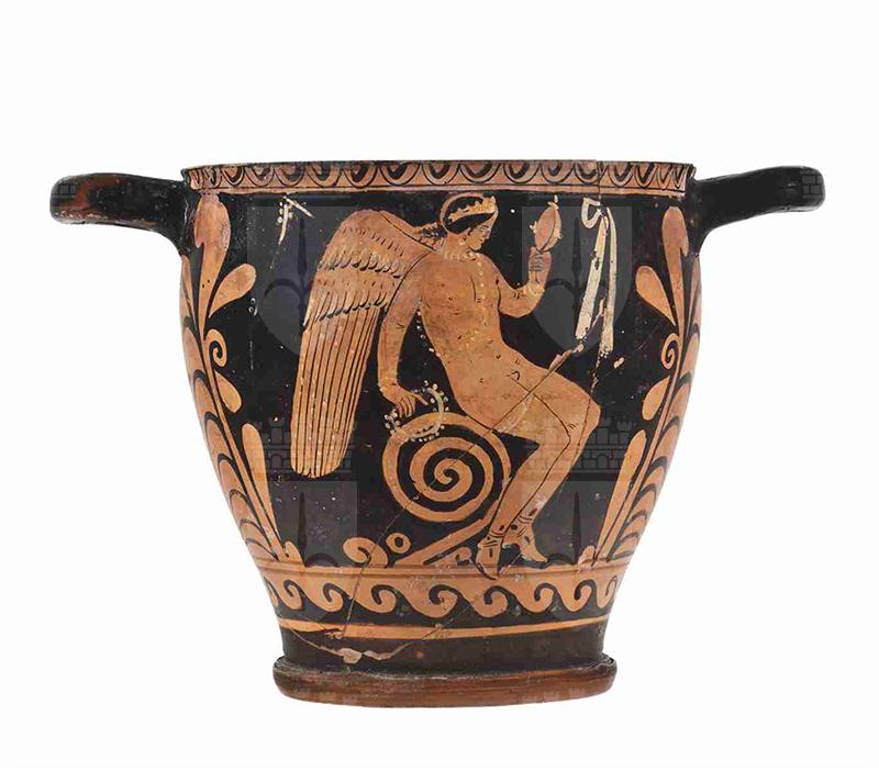Il vaso presenta un corpo di forma troncoconica dal profilo leggermente convesso, rialzato su un piede ad anello dal profilo convesso e con listello, con tracce di vernice nera. Le anse a nastro sono impostate orizzontalmente poco sotto l'orlo, leggermente estroflesso. La vernice nera, opaca, copre interamente anche l'interno della vasca del vaso. Alcuni dettagli, come sulle ali dell'erote, presentano sovradipinture in bianco. Il colore dell'argilla varia da Munsell 5YR 6/6 (reddish yellow) a 2.5YR 5/8 (red). Sul lato A troviamo un erote alato, rivolto a sinistra, nudo ad eccezione dei calzari, seduto su un tralcio a spirale. Porta i capelli ricciuti raccolti all'altezza della nuca, cinti da un diadema; le ali sono molto curate, con tre file di penne, le due superiori, più corte, dettagliate da piccoli tratti paralleli, quella inferiore con file verticali di punti bianchi. Regge nella mano sinistra, poggiata sul tralcio, un serto e nella sinistra, portata all'altezza del volto, uno specchio. Porta inoltre dei gioielli: una collana e una bandoliera di perle; i gioielli, il serto e lo specchio presentano dettagli sovradipinti in bianco. Compaiono, sospesi e resi in bianco, un tralcio fiorito sulla sinistra e un nastro. Sul lato B, vi è la tozza figura di un giovane ammantato, di profilo, rivolto a sinistra, rappresentato in maniera piuttosto rozza: l'himation nasconde completamente il corpo, ad esclusione del braccio e della spalla destra ed è decorato con una fascia nera presso il collo, ornato da ricche pieghe, e l'orlo inferiore. Il giovane porta i capelli corti cinti da una fascia e si appoggia ad un bastone con la mano destra. Anche su questo lato, una ghirlanda e un nastro sono sospesi sullo sfondo. La decorazione accessoria include un motivo ad ovuli pendenti subito sotto all'orlo, limitato da un filetto a ri-sparmio. Sotto le figure, inquadrato da due filetti a risparmio, dei quali quello superiore funge da appoggio alle figure stesse, un motivo ad onde marine sinistrorso. Ai lati, una grande palmetta affiancata da motivi fogliati e girali. Sotto il piede è presente una vecchia etichetta, indicante la data di acquisizione da parte del museo ('12 luglio 1905') e l'attuale numero di inventario generale.