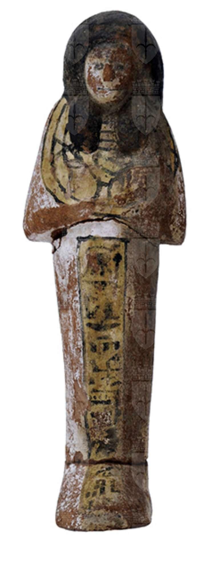 Statuina funeraria mummiforme che indossa un collare ed una parrucca doppia dipinta in nero. Si vedono ancora le tracce di bianco e giallo dello sfondo. Le braccia sono incrociate, la destra sopra la sinistra, e le mani impugnano ognuna una zappa nera. Sulla schiena, anch’essi in nero, un bilanciere con due fiaschette ed una sacca che pende dalla spalla destra. L’iscrizione, in nero, è costituita da una colonna a sfondo giallo con linee divisorie in nero che corre lungo le gambe.