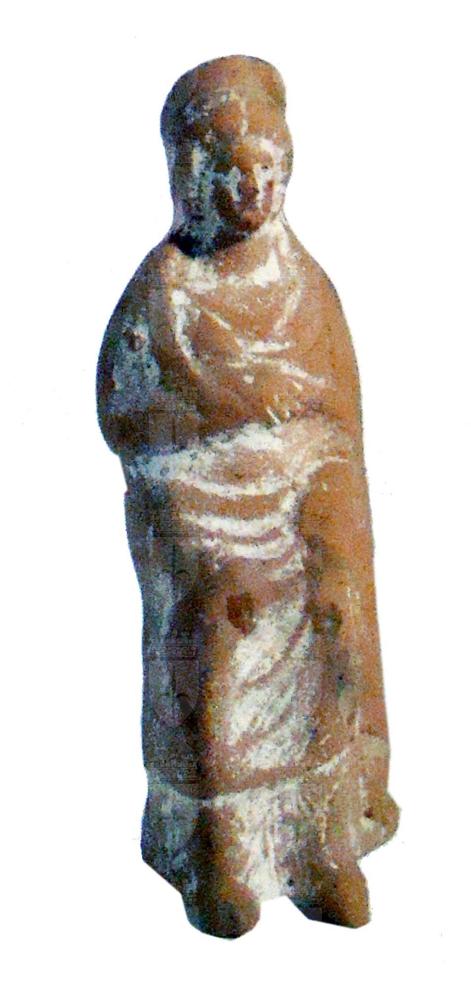 Statuina in terracotta realizzata a matrice. Cava. Presenta sul retro la scritta in nero "359" e in rosso "2709". Riporta l'etichetta con scritto "Rudiae Ostr. 255". Sulla basetta moderna lignea è apposta l'etichetta "2 (...)8". Non lavorata sul retro. Figura femminile seduta con veste con scollatura a V e piegoline a rendere il panneggio. . La figura indossa un hymation che copre un lungo chitone drappeggiato terminante ai piedi con delle scarpe realizzate a punta. Il capo è cinto da un polos e in viso porta due pendenti circolari. Velata e con mantello che le avvolge il lato sinistro del corpo. Anche la mano appoggiata sul ginocchio è coperta. Il braccio destro è invece piegato ad angolo retto sul petto e la mano tiene stretto un lembo del mantello. Del volto ben visibili occhi, naso e bocca.