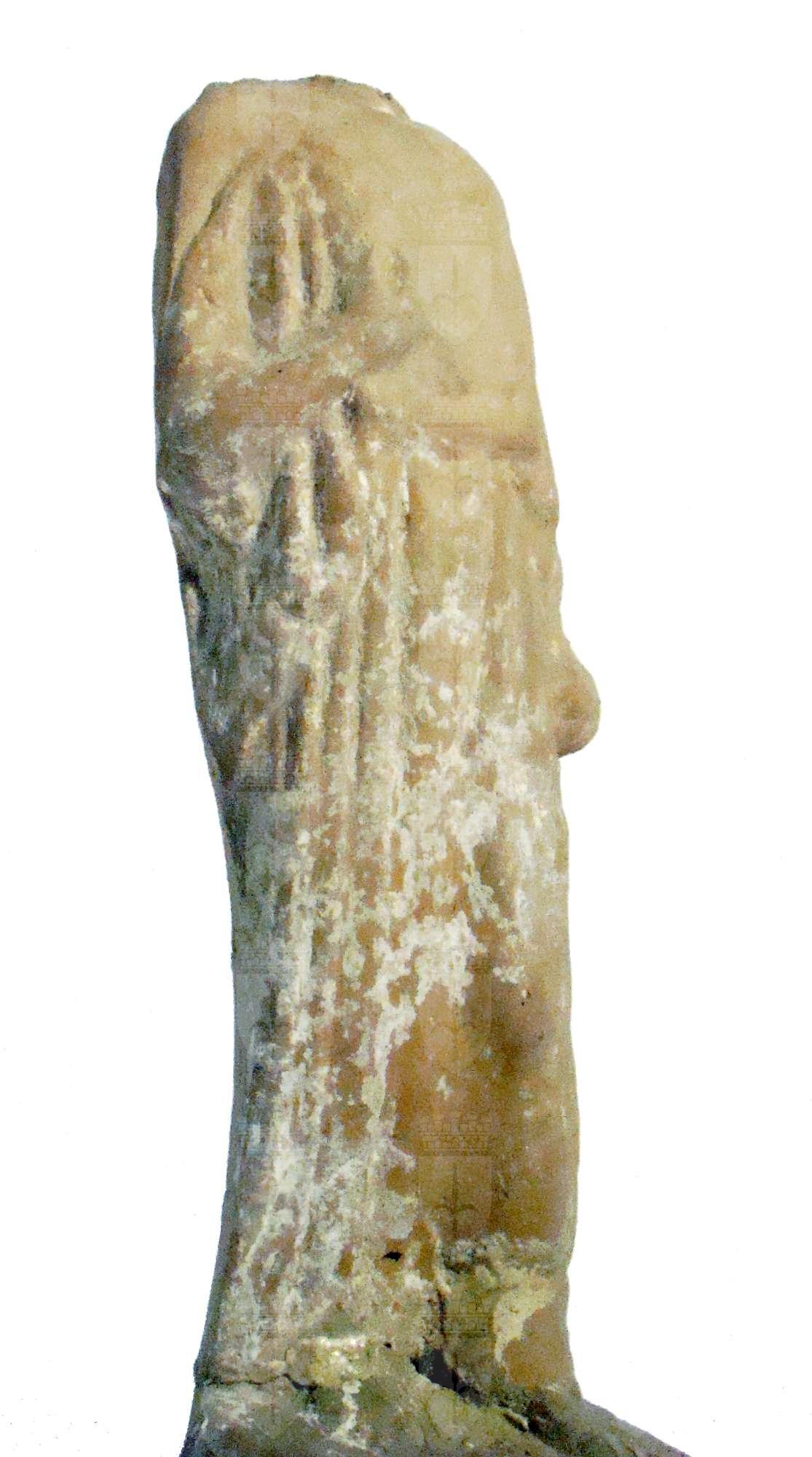 Figurina femminile in terracotta, realizzata a matrice. Reca la cifra in rosso "5110" e un'etichetta ovale con dicitura "28 Febbr. 74 Baldini GRECIA". Retro non lavorato. Figura femminile stante, con gamba sinistra avanzata. Indossa un peplo. Braccio sinistro disteso lungo il corpo, stringe forse un frutto. Il braccio destro è piegato sul petto.