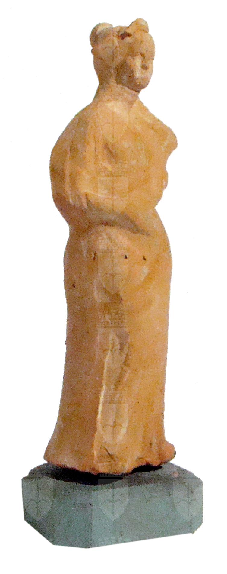 Figurina in terracotta, realizzata a matrice. Cava. Etichetta attaccata al collo con dicitura "652 GRECIA". Basetta moderna lignea. Sul retro scritta in matita "672" e cifra in rosso "4636", poi cancellata a matita. Retro non lavorato. Figurina femminile, stante, con la gamba destra piegata in avanti. La mano destra sorregge una cornucopia. Alto chignon.