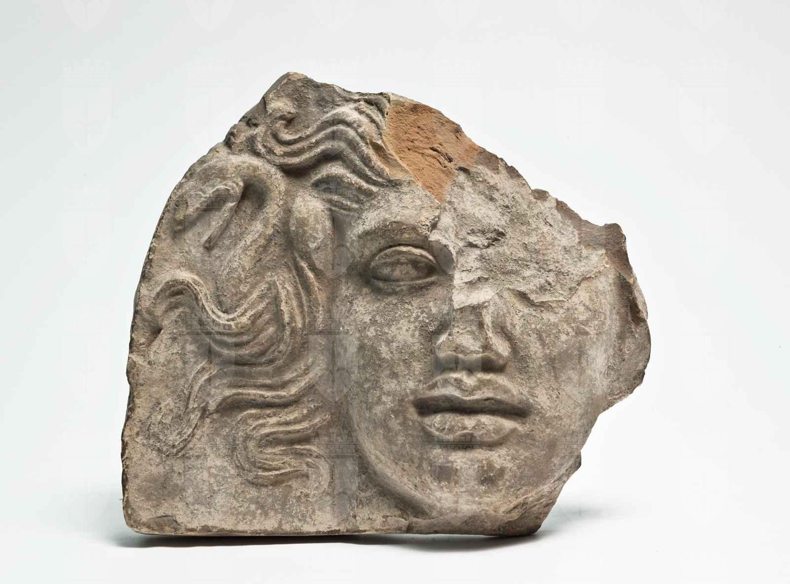 Argilla color beige, in frattura colore arancione scuro. La forma del viso e delle labbra e ciò che resta del naso assomigliano molto a quelli dell’antefissa inv. 2370; simili sono anche le chiome, rese in modo abbastanza plastico, e il serpente. Non si esclude che sia stata usata la medesima matrice, ma lo stato incompleto delle due antefisse non consente confronti puntuali e decisivi, per quanto le somiglianze siano davvero notevoli, soprattutto nelle labbra, piuttosto carnose e nel taglio dell’occhio sinistro. Anche le misure del viso e della bocca (rispettivamente cm 10,5 e cm 4,3) coincidono.