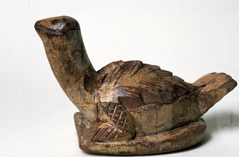 Su una base piana di forma ovale, tagliata orizzontalmente sul davanti, poggia una colomba ad ali chiuse, modellata in terracotta bruno rosata lavorata a stecca con abbondanti tracce del rivestimento bianco-ocra. Il piumaggio è reso con rilievo appena accennato e con incisioni a spina di pesce. Sul lungo collo la piccola testa ha occhi rotondi incavati e becco chiuso appena accennato. La coda a spatola e le grosse zampe, più simili a quelle di una tartaruga, piegate sotto il corpo dalla superficie segnata da un'incisione a reticolato. La figura è piena e la base presenta inferiormente incise una serie di linee parallele oblique intersecate da altre perpendicolari rese a trattini.